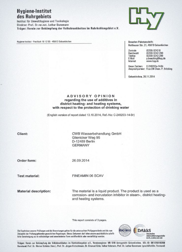 Our German partners, CWB Wasserbehandlung GmbH, have had our corrosion and scale inhibitors tested (FINEAMIN 06 SCAV) by the Institute of Hygiene (DIN EN 1717 and DIN 1988-100) and approved as being fit for usage in district heating systems and domestic hot water production.