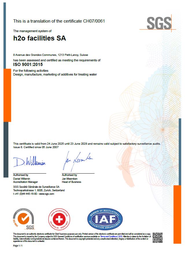 Swiss accredited, our water treatment polyamines-based chemical additives are designed, manufactured and marketed by our h2o facilities production plant in Geneva, Switerland, according to ISO 9001:2015 and ISO 14001:2015 requirements, from high-quality components and respecting REACH guidelines.